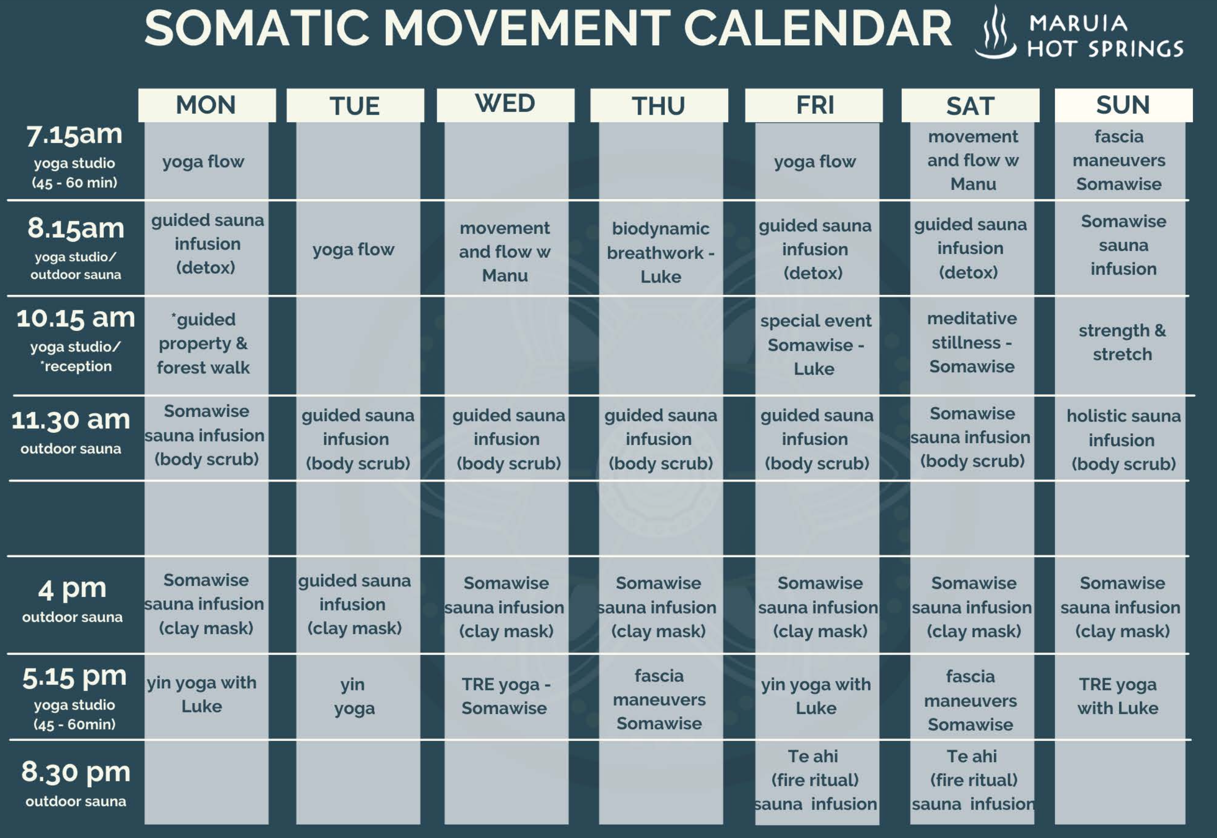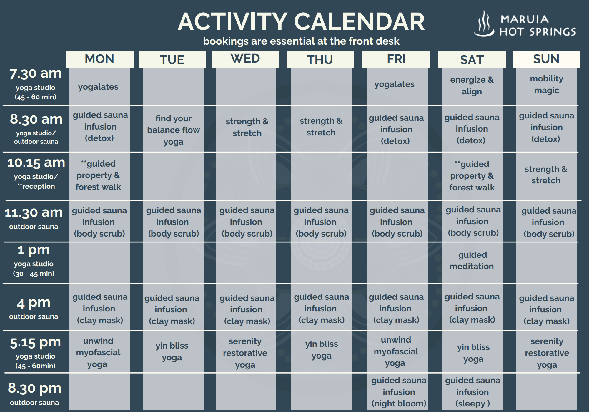 all overnight stays include a calendar of wellness activities for you to enjoy during your stay. including our guided ‘signature sauna infusion’ with home made face masks or body scrub, daily yoga classes and a guided nature trail walk. These can be booked when you arrive, but make sure to pack your yoga pants, swimsuit, jandles and suitable walking shoes!
